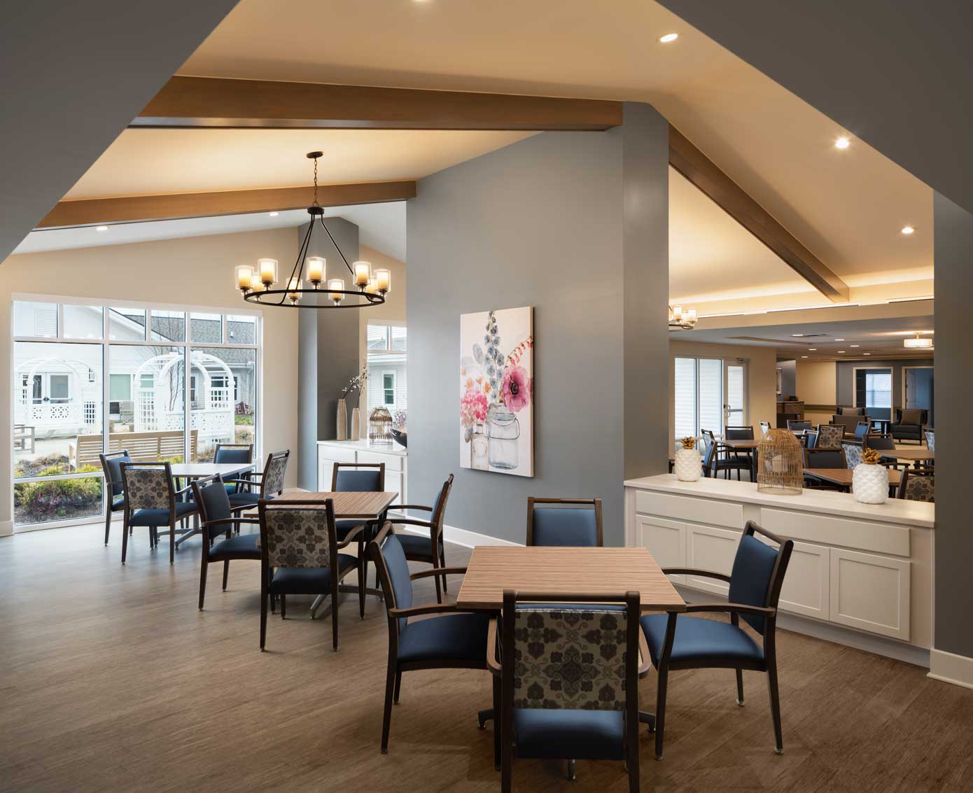 The Memory Care residence is designed to function as two separate households with their own dining, living and activity areas. Each household has direct access to the secure, beautifully landscaped courtyard. Operational efficiency was achieved by centrally locating the main production kitchen and back-of -house service areas between the Commons and the memory care.