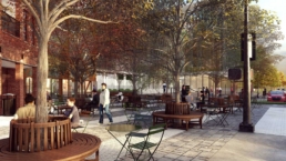 The design takes into consideration safety and security concerns by promoting natural surveillance. This is accomplished through the inclusion of a centrally located plaza that opens onto the public right-of-way, an amenity zone in the new streetscape, a mix of uses, and the improvement of sightlines.