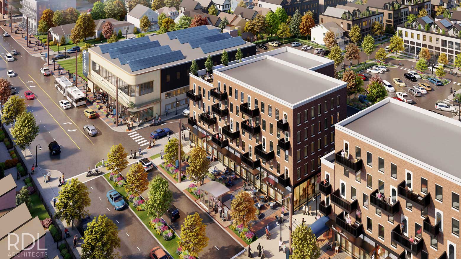 Through the use of photorealistic renderings and animation, RDL crafted a community-focused design centered around mixed-use development, infill residential construction, improved pedestrian streetscapes, and a large plaza for outdoor gatherings. Our proposed design creates a strong connection with the street through the implementation of new porches, balconies, and the re-orientation of the buildings toward public space. Another key component of this project is the addition of new midblock connections, which create streets with parallel parking and sidewalks along the front of the homes – ensuring the parking spaces aren’t isolated in secluded areas.