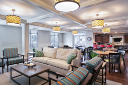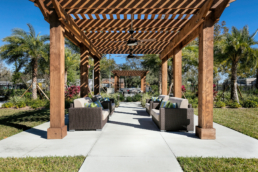 Reserved for seniors 55+, Grand Palms is a pet-friendly community that offers a mix of one and two-bedroom units. The common space includes a community room, kitchenette, café, third floor balcony, and wellness center. The courtyard features a large patio with heavy timber shade trellis surrounded by beautiful, terraced gardens and a dog run to allow residents to enjoy the Florida scenery year-round. A sculpture solar tree was incorporated along the street frontage in support of the local arts initiative. A ‘West Indies’ interior flare in furniture, fabric and artwork creates a colonial infused Caribbean aesthetic. Bold blue and red accents complement the dark wood-look flooring and other natural materials used.