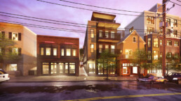 - Rehabilitation of 12404 Mayfield Road: This existing three-story, wood-framed, mixed-use building is currently architecturally unremarkable. While the current building will remain intact to preserve historical and cultural features, significant façade rehabilitation will ultimately restore its original relationship with the sidewalk. Ground floor retail opportunities will be enhanced while also adding new balconies and a rooftop loft that transform the residential experience on the upper floors.