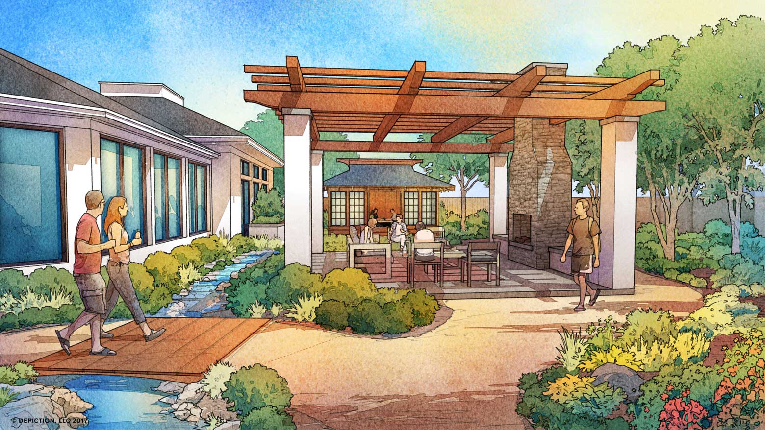 The two-story interior renovation with a single-story addition consists of eight medical detox units and twelve semi-private units of shared living space. The renovation added lounge spaces, fitness and exercise facility, media/meeting room, indoor pool with hot tub, a sauna, outdoor water features and walking paths.