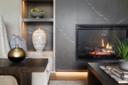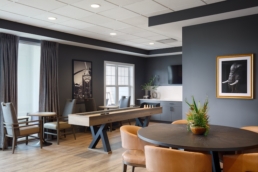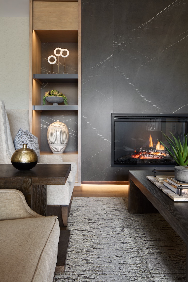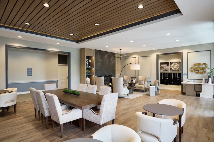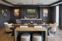 The first impression is of an inviting lobby fireplace with large porcelain tile slabs and custom built-in wood veneered shelving. Residents are encouraged to lounge and socialize as this community space offers plenty of comfortable seating, transitional furnishings, and casual dining offerings.