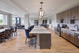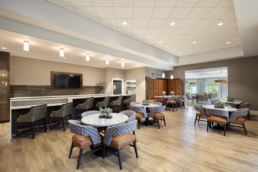 The new skilled nursing community consists of a 14-bed, short-term rehabilitation wing with a hospitality feel and direct adjacency to a physical therapy gym and cafe. Long-term care is comprised of two households, each with its own dining, living, and kitchen spaces. Existing Assisted Living renovations included development of both casual and formal dining, as well as additional activity and gathering spaces.